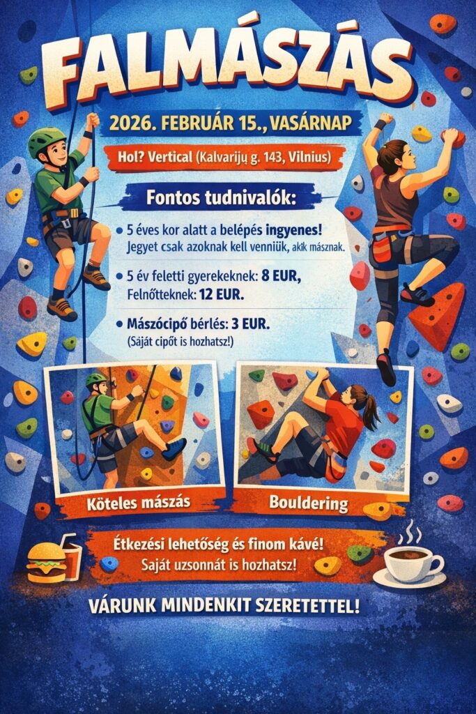 Sok szeretettel várunk Titeket most vasárnap egy közös falmászásra 10:30-as kezdéssel a Verticalban (Kalvariju g. 143., Vilnius)! 🧗 Köszönjük Balázsnak az ötletet és a szakszerű vezetést a helyszínen! 🤗