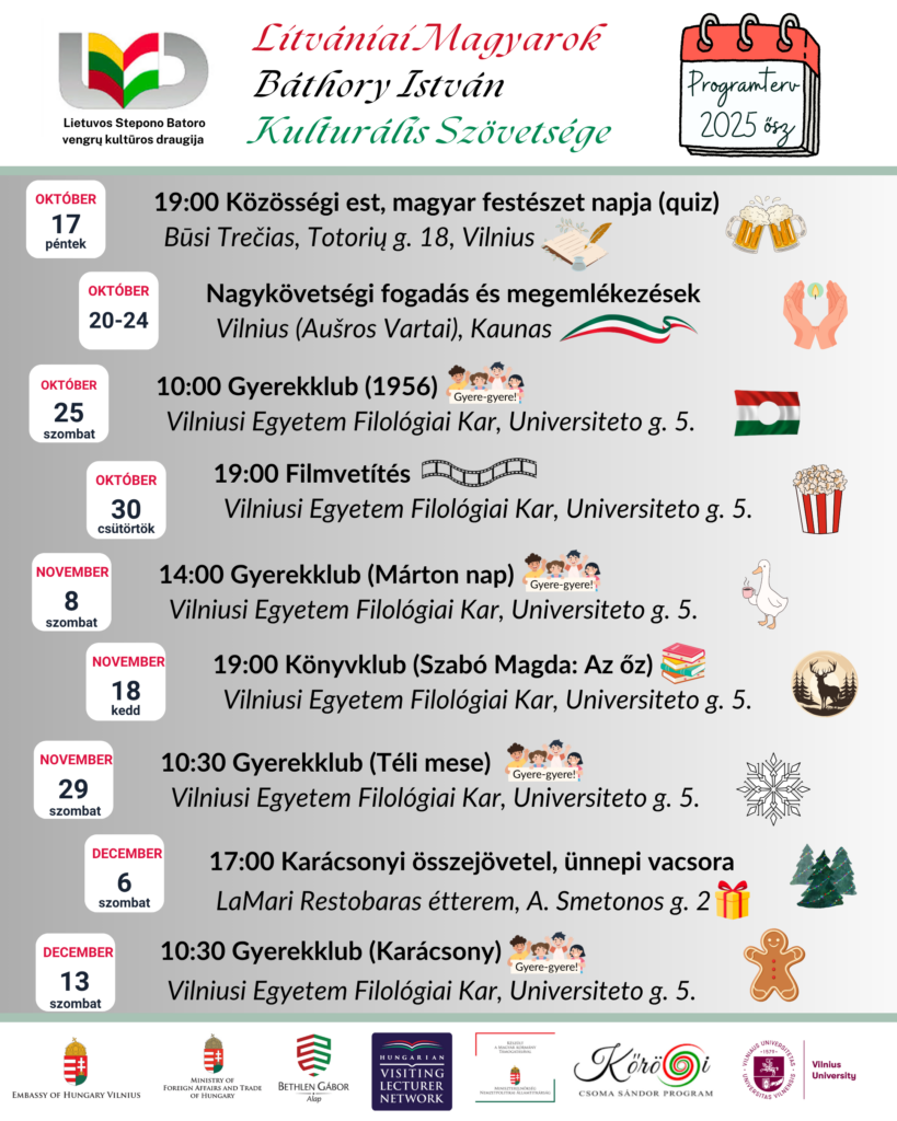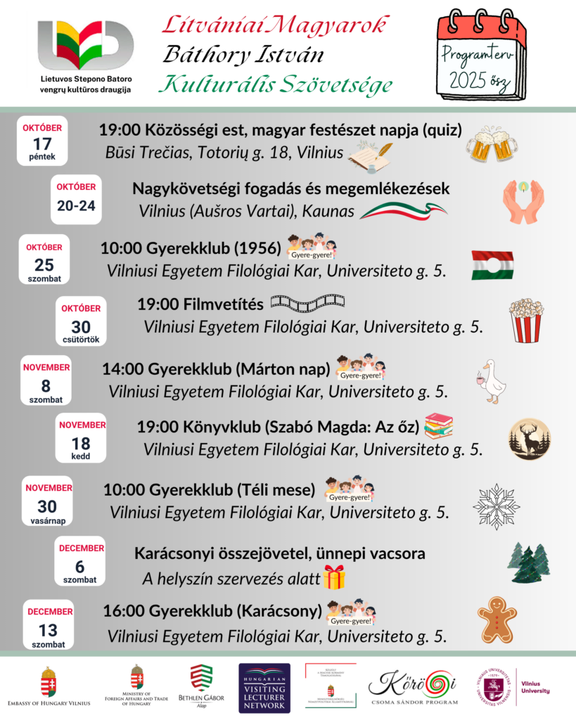 Programok Márton-napi gyerekklub A Šiauliai légibázis meglátogatása Októberi gyerekklub és megemlékezés Őszi pillanatok Magyar előadók látogatása a 2025-ös LITAKA konferencián