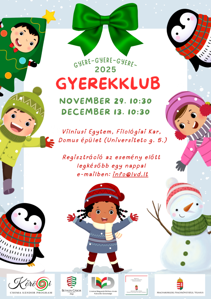 Az év utolsó két gyerekklubját november 29-én (szombaton) 10:30-tól és december 13-án szombaton 10:30-tól tartjuk a Vilniusi Egyetemen. Ahogy eddig is, a gyerekeknek játékokat, mondókákat és kézműves feladatokat viszünk, a felnőtteknek pedig kávéval és teával készülünk. Egészséges nassolnivalókat, házi süteményt ezúttal is szívesen várunk az eseményen!