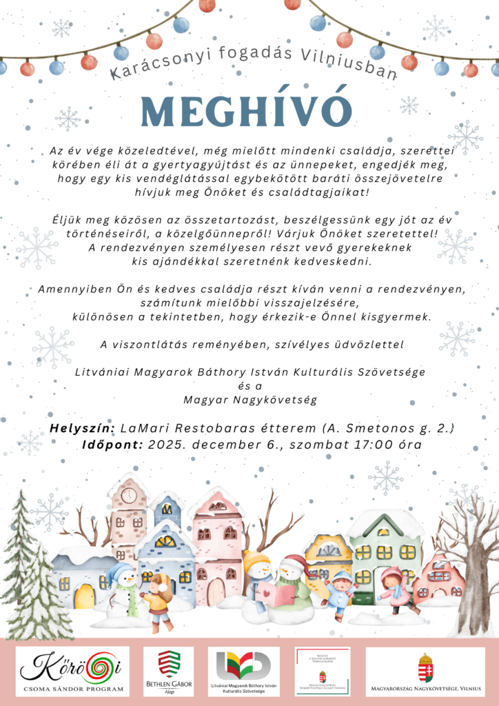 A Litvániai Magyarok Báthory István Kulturális Szövetsége és Magyarország Vilniusi Nagykövetsége sok szeretettel meghívja a Litvániában élő magyar közösség tagjait az éves karácsonyi fogadásra 2025. december 6-án 17:00-tól. Kérjük, hogy a részvételi szándékot a mission.vno(kukac)mfa.gov.hu e-mail címen legyenek kedvesek jelezni minél hamarabb.